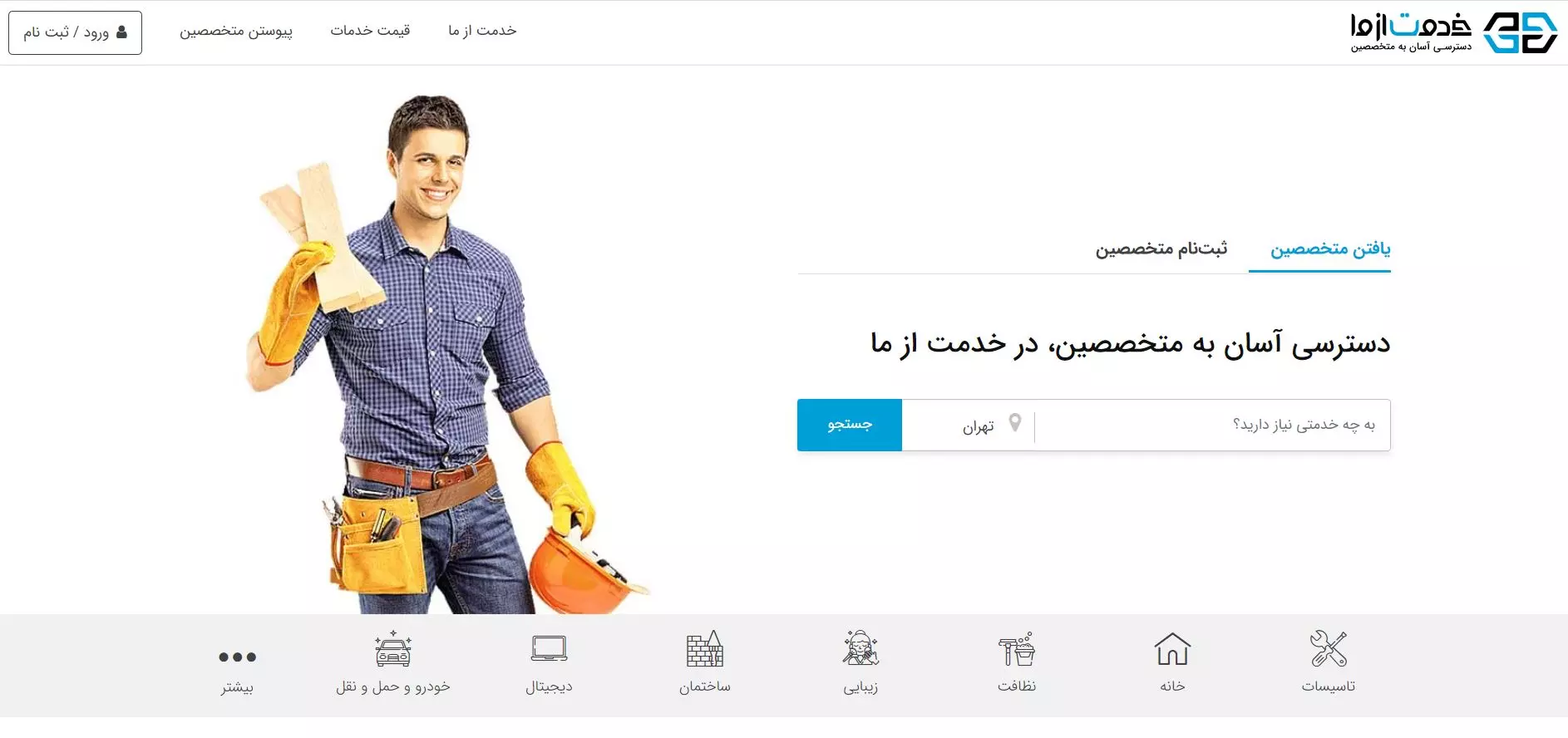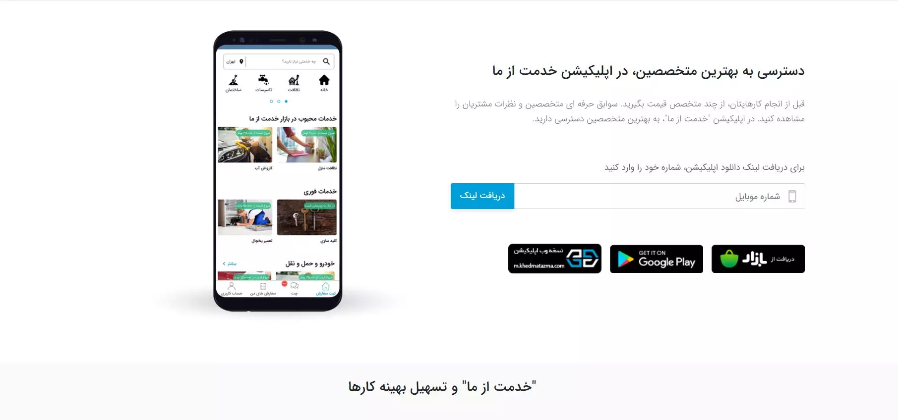 خدمات سامانه خدمت از ما چیست ؟ : خدمت از ما، سامانهای برای دسترسی آسان به متخصصین در حوزههای مختلف مثل تاسیسات، نظافت، خانه، زیبایی، دیجیتال، خودرو، تعمیرات، باربری، باغبانی و … است. در گذشته بعضی از آرزوها را در سر داشتیم و همیشه در این فکر بودیم کاش علم پیشرفت می کرد تا کارها آسان تر شود اما امروزه آن آرزوهای دور تحقق یافته و بسیاری از خدمات با وجود اپلیکیشنهای مختلف فقط و فقط با یک گوشی هوشمند در دسترس است. کارهایی که تا همین چند سال پیش به سختی انجام میشد و وقت و هزینه زیادی از ما میگرفت حالا به لطف سامانهها و اپلیکیشنها به راحتی قابل مدیریت است.